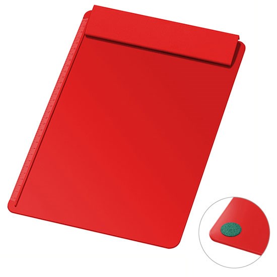 mit Klemmleiste, seitlichem Anschlag und 30 cm Skala. Ein beliebter Werbeträger, immer im Blickfeld bei Messen, Schulungen, im Büro oder Lager, mit 4 geräuschdämpfenden Filzpunkten auf der Plattenrückseite, ohne Papier.