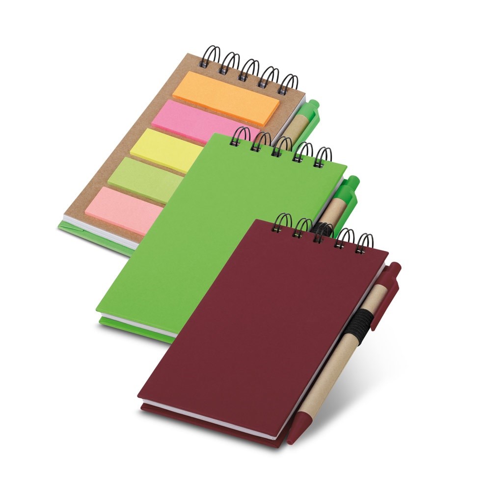 Schreibblock mit bunten Haftmarkern (25 Stk/Farbe) und Kugelschreiber mit blauschreibender Mine. Umweltfreundliches Produkt. 90 x 143 x 13 mm