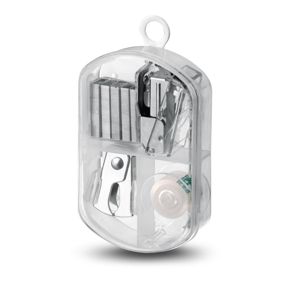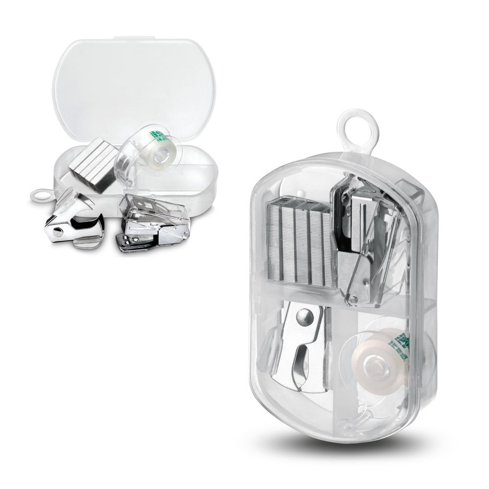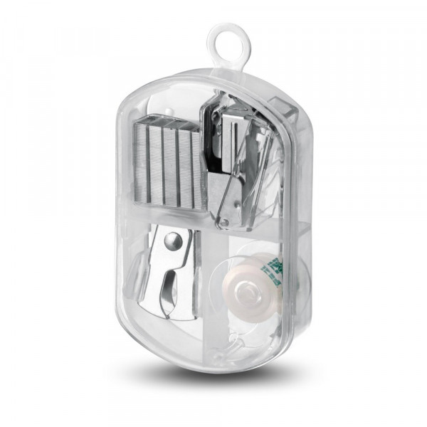 Büroset in einer Kunststoffbox. Inklusive Tacker, Enthefter, Heftklammern und Klebestreifenrolle. 93 x 60 x 20 mm