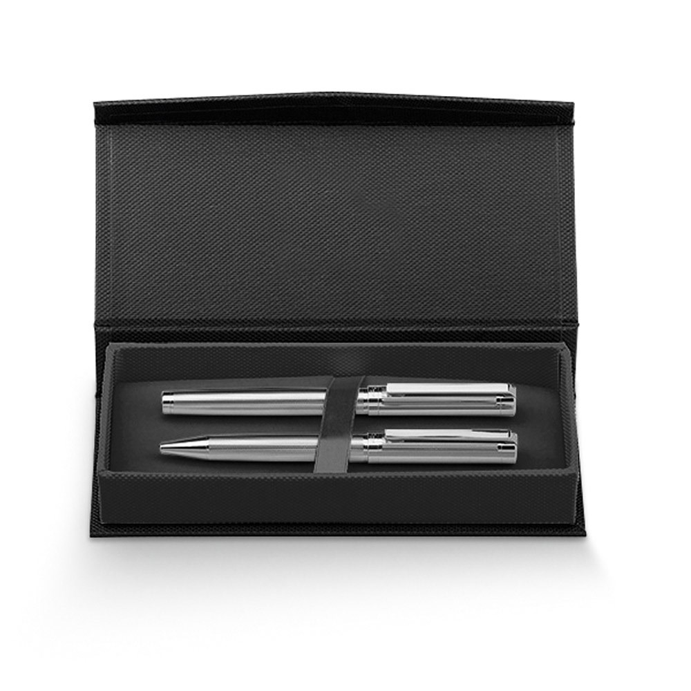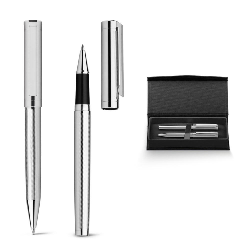 Set bestehend aus Kugelschreiber mit Drehmechanismus und Rollerball aus Metall, beide mit Clip. Sehr elegantes Set, ideal für ein besonderes Geschenk. Geliefert in einem gepolsterten Geschenketui. Kugelschreiber: ø12 x 139 mm | Roller: ø12 x 139 mm | Schachtel: 192 x 34 x 85 mm