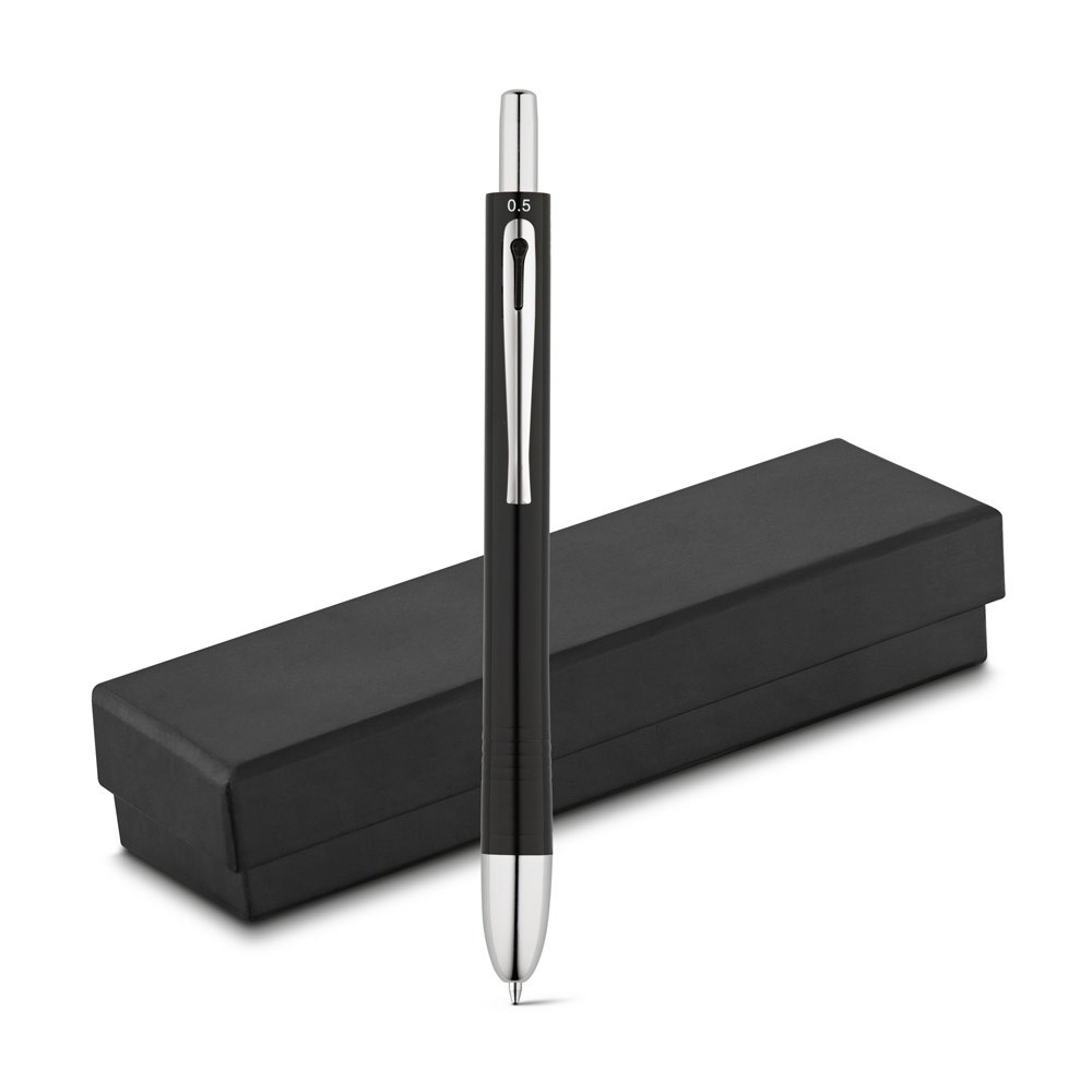 Kugelschreiber 4-in-1 aus Metall mit eingebautem Minenbleistift, Metallclip und Klickmechanismus. Inklusive blau-, rot- und schwarzschreibenden Minen sowie einem Minenbleistift. Geliefert in einem gepolsterten Geschenketui. ø10 x 132 mm | Kugelschreiber Etui: 150 x 43 x 24 mm
