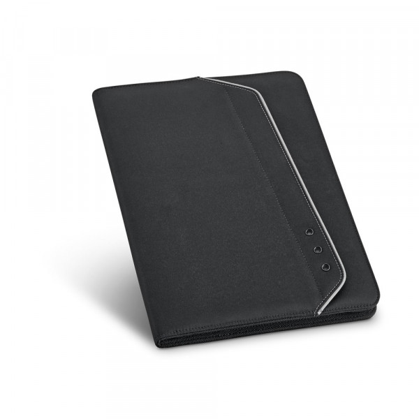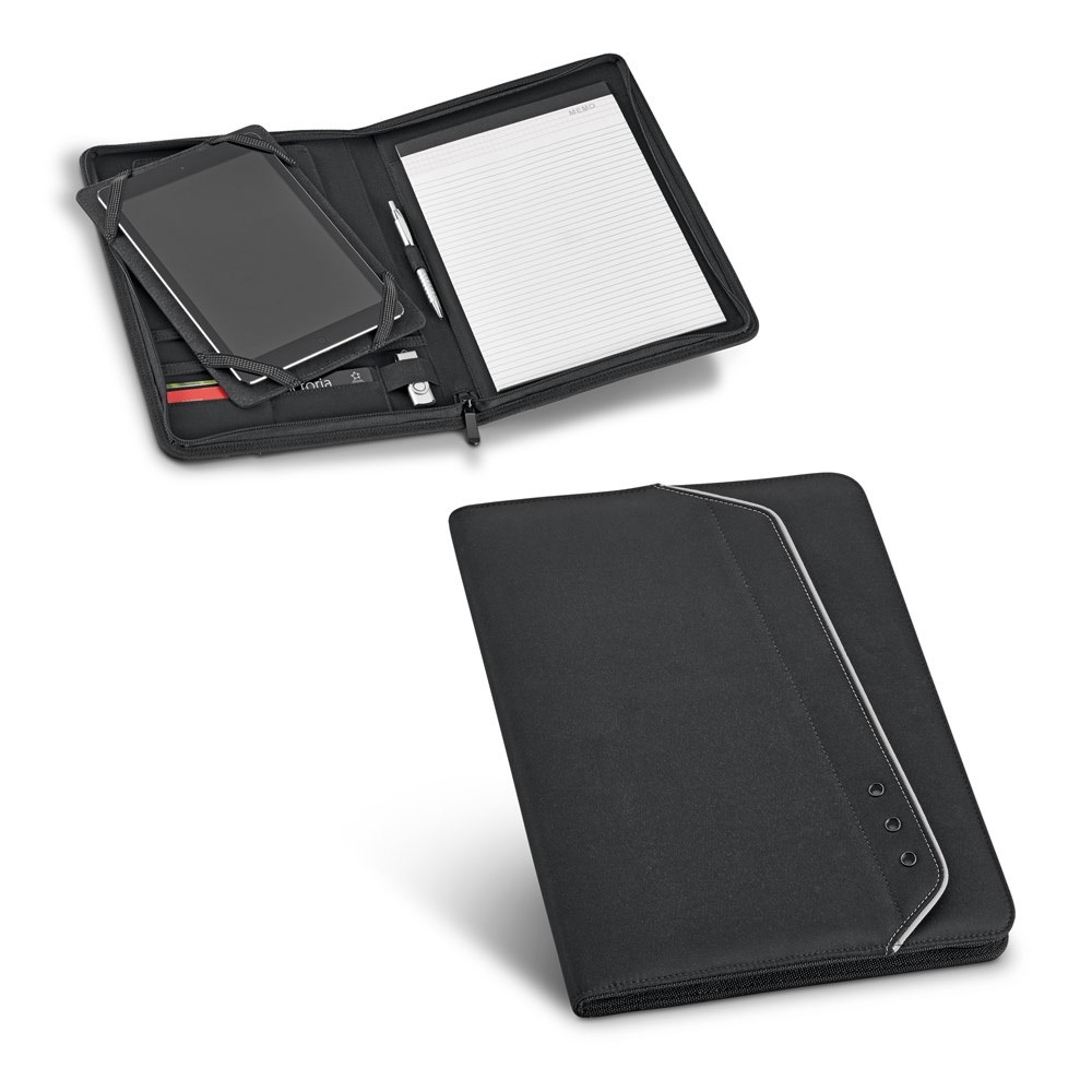 A4 Schreibmappe mit Tablethalterung . Mikrofaser. Konferenzmappe mit einer Vordertasche, einem Reißverschluss, Kartenfächern und einem Notizblock: 20 linierte Blätter. Kugelschreiber nicht enthalten. 260 x 355 x 25 mm