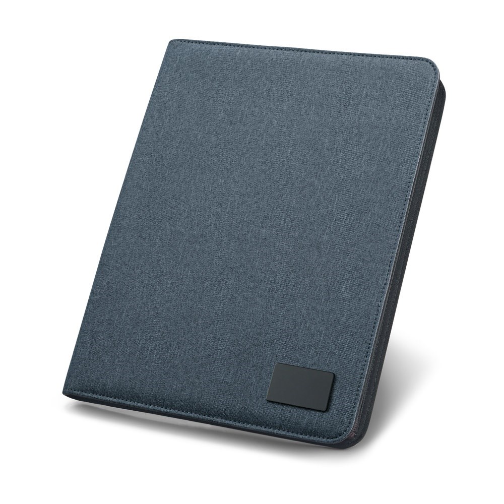 Schreibmappe A4 aus Leinen- und Lederimitation mit Reißverschluss, einem Smartphone- und Kartenfach. Die Mappe hat ein veredelbares Metallplättchen mit gummierter Oberfläche und ein Notizblock mit 20 linierten Blättern. Kugelschreiber und Zubehör nicht enthalten. 259 x 336 x 27 mm | Plättchen: 50 x 30 mm