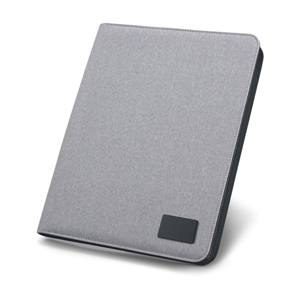 Schreibmappe A4 aus Leinen- und Lederimitation mit Reißverschluss, einem Smartphone- und Kartenfach. Die Mappe hat ein veredelbares Metallplättchen mit gummierter Oberfläche und ein Notizblock mit 20 linierten Blättern. Kugelschreiber und Zubehör nicht enthalten. 259 x 336 x 27 mm | Plättchen: 50 x 30 mm