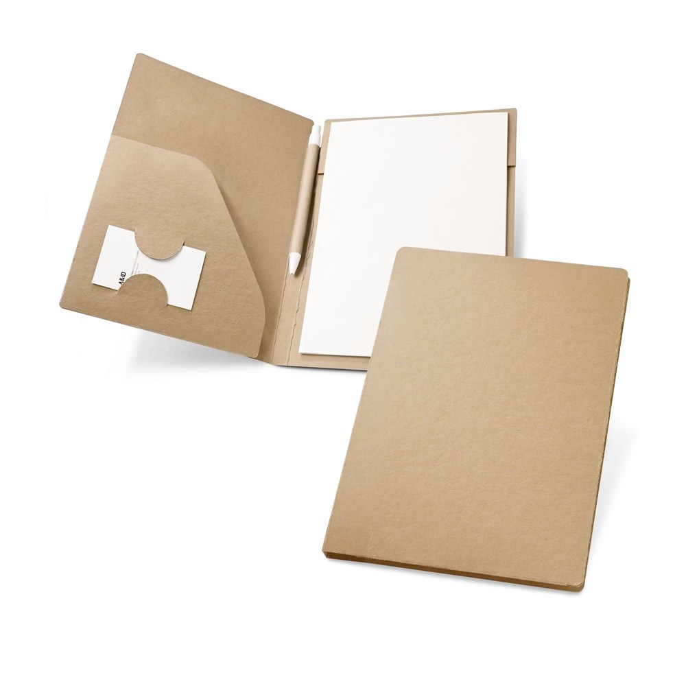 Schreibmappe A5 aus Karton (450 g/m²) mit einem Dokumentenfach und Kartenhalterung. Diese Mappe beinhaltet einen Notizblock mit 20 recycelten unlinierten Blättern und einen Kugelschreiber. 168 x 230 x 15 mm