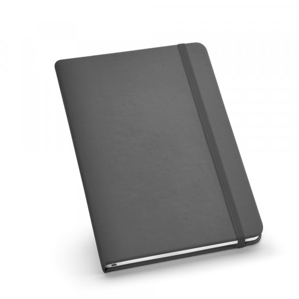 Notizbuch A5 mit Hardcover aus Lederimitation, 160 unlinierten Seiten und einem Gummiband. 140 x 210 mm