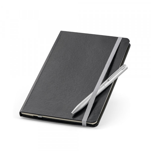 Schreibset bestehend aus einem Kugelschreiber aus Aluminium mit Metalclip und einem A5 Notizbuch mit Hardcover, dieser hat eine Innentasche und 160 linierten Seiten in Elfenbeinfarbe. Geliefert in einer Geschenkschachtel. Kugelschreiber: ø10 x 138 mm | Notizbuch: 137 x 210 mm | Schachtel: 190 x 240 x 30 mm