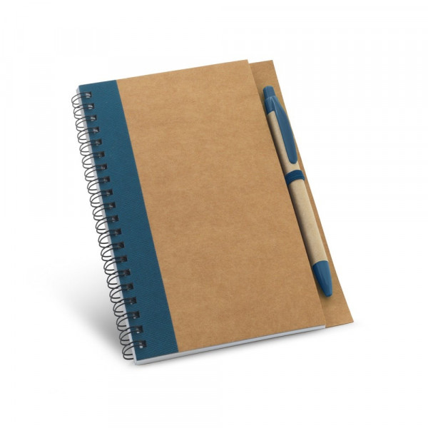 Notizblock B6 mit Hardcover aus Kraftpapier und 120 unlinierten Seiten aus recyceltem Papier. Kugelschreiber enthalten. 130 x 177 mm