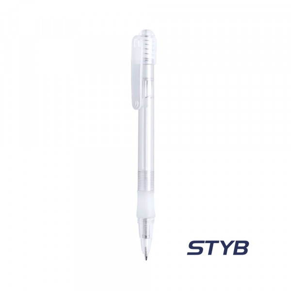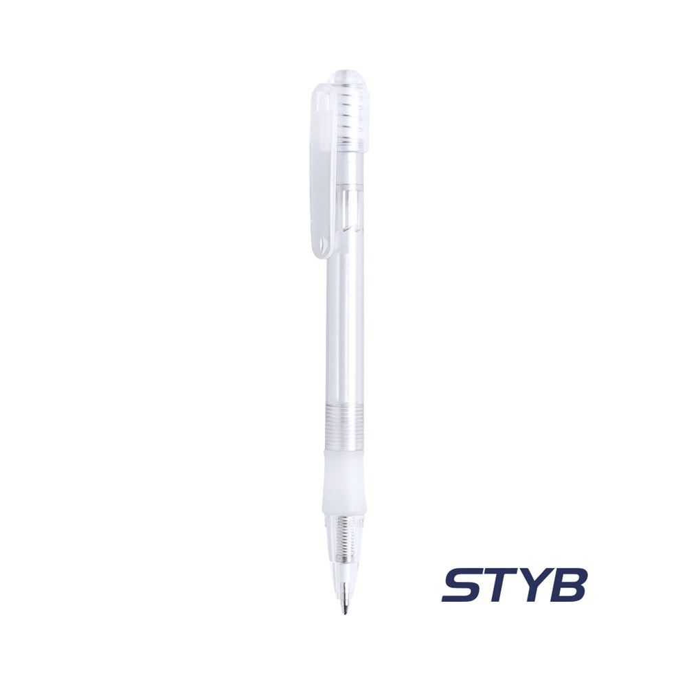 Druck-Kugelschreiber mit halbtransparentem Schaft in verschiedenen Farben und Details in transparentem Weiß. Mit angenehm weichem Gummigriff und ein blauer Tinte.