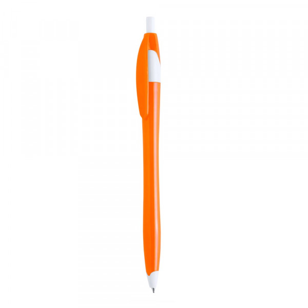 Druck-Kugelschreiber mit zweifarbigem Design und geschwungenem Körper in fröhlichen kräftigen Farben. Mit farblich passendem Clip und blauer Tinte.