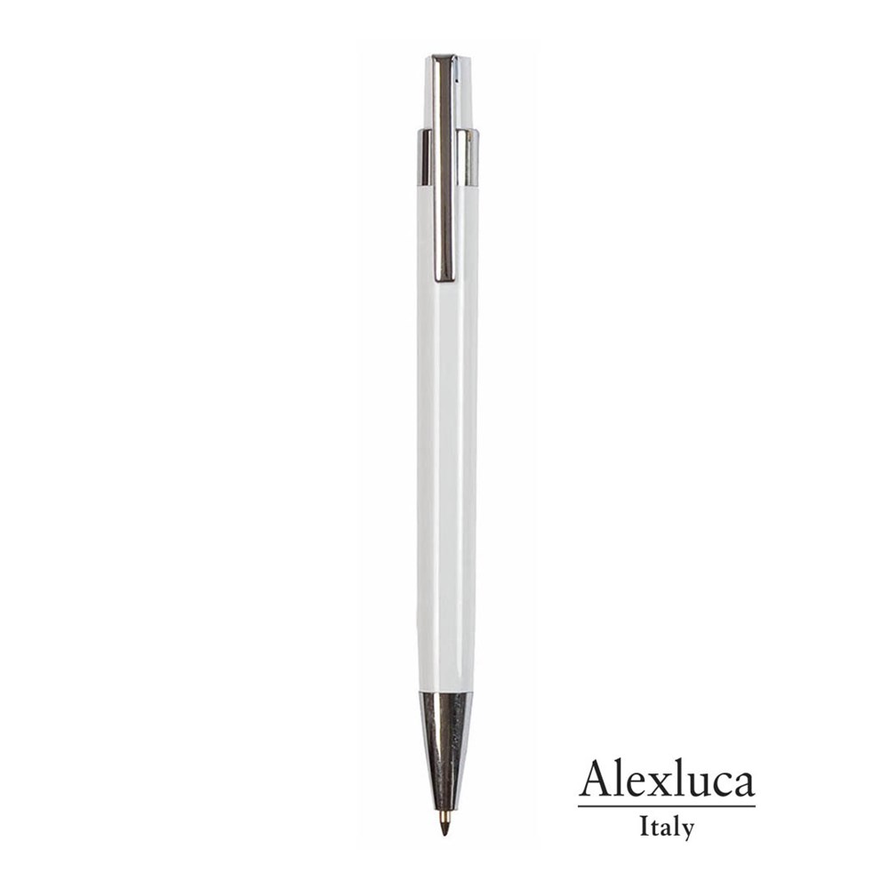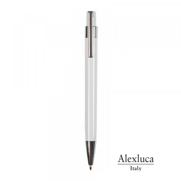 Druck-Kugelschreiber von Alexluca mit elegantem, zweifarbigem Design und geschmeidigem Körper in glänzender Ausführung und auffälligen Farben. Mit Details in glänzendem Silber und Markenlogo auf der Oberseite des Druckknopfes. Jumbo-Patrone mit blauer Tinte.