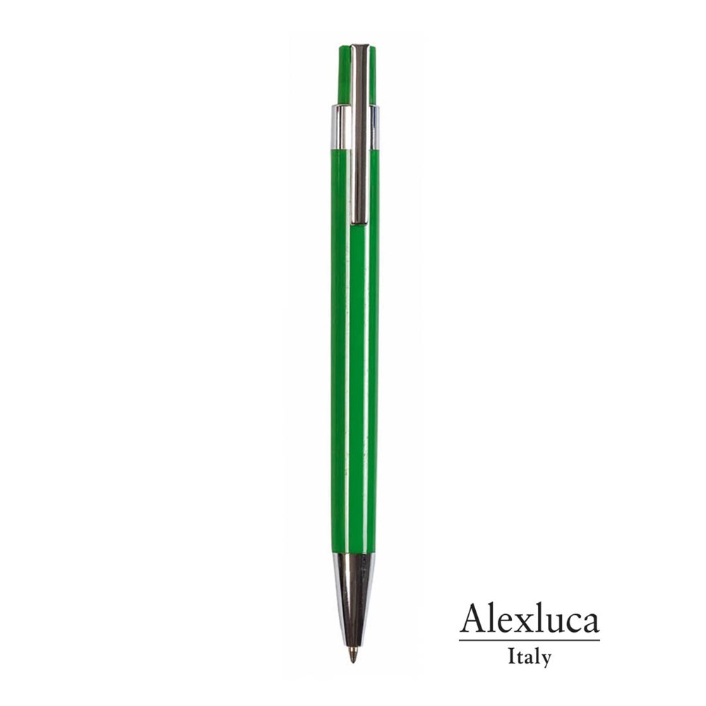 Druck-Kugelschreiber von Alexluca mit elegantem, zweifarbigem Design und geschmeidigem Körper in glänzender Ausführung und auffälligen Farben. Mit Details in glänzendem Silber und Markenlogo auf der Oberseite des Druckknopfes. Jumbo-Patrone mit blauer Tinte.