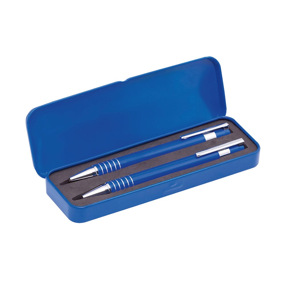 Set aus Druck-Kugelschreiber und Druck-Bleistift mit originellem, zweifarbigem Design. Beide in geschmeidiger Metall-Ausführung in lebendigen Farben mit Kontrastdetails in Silber. Mit geriffeltem Griff. Präsentiert in einem robusten, individuellem Metall-Etui mit Schaumstoff im Inneren. Kugelschreiber mit blauer Tinte und Bleistift mit 0,7 mm Minen.