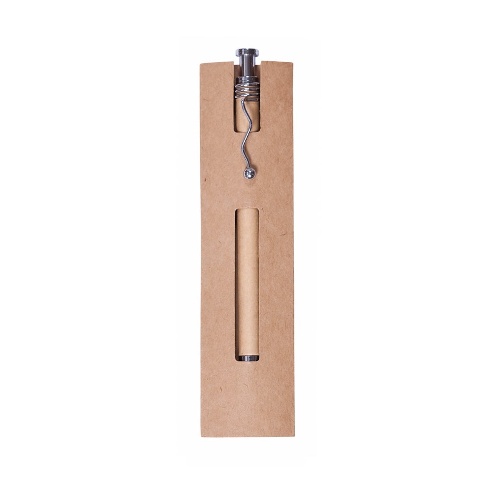 Druck-Kugelschreiber aus origineller Materialkombination: Körper aus recyceltem Karton in Naturfarbe und Kontrastdetails in elegantem Schwarz und Silber. Mit originellem Metallclip. Präsentiert in einer individuellen, farblich passenden Box aus recyceltem Karton. Blaue Tinte.