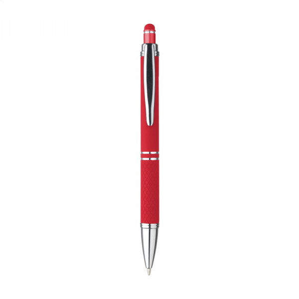 Blauschreibender Aluminium-Kugelschreiber mit Metallclip und gummierter Spitze für das Bedienen von Touchscreens (wie iPhone/iPad). Der Halter ist mit einer schönen gummierte Soft-Touch-Oberfläche versehen. Auf dem Vorderteil ist ein spielerisches Relief angebracht, das für einen festen Griff sorgt. Bei diesem Stift wurde viel Wert auf kleine zusätzliche Details gelegt. Das macht sein Design auffallend attraktiv.