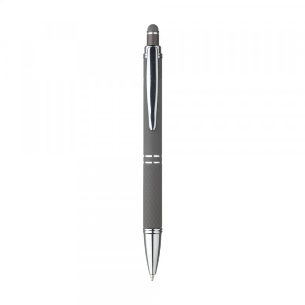 Blauschreibender Aluminium-Kugelschreiber mit Metallclip und gummierter Spitze für das Bedienen von Touchscreens (wie iPhone/iPad). Der Halter ist mit einer schönen gummierte Soft-Touch-Oberfläche versehen. Auf dem Vorderteil ist ein spielerisches Relief angebracht, das für einen festen Griff sorgt. Bei diesem Stift wurde viel Wert auf kleine zusätzliche Details gelegt. Das macht sein Design auffallend attraktiv.