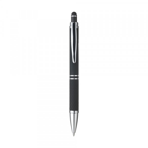 Blauschreibender Aluminium-Kugelschreiber mit Metallclip und gummierter Spitze für das Bedienen von Touchscreens (wie iPhone/iPad). Der Halter ist mit einer schönen gummierte Soft-Touch-Oberfläche versehen. Auf dem Vorderteil ist ein spielerisches Relief angebracht, das für einen festen Griff sorgt. Bei diesem Stift wurde viel Wert auf kleine zusätzliche Details gelegt. Das macht sein Design auffallend attraktiv.