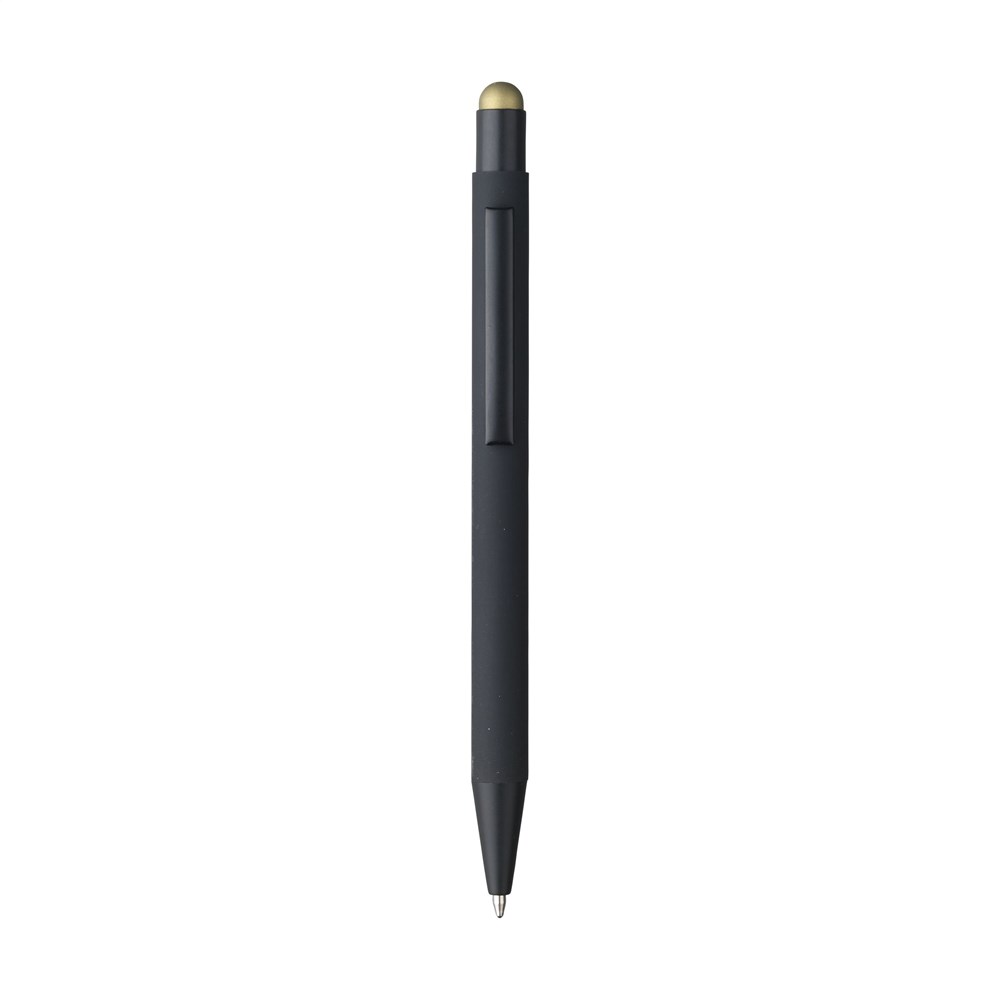 Schlanker, blauschreibender Kugelschreiber mit Gummihalter, mattschwarzem Metallclip und farbigem Gummiknopf/Pointer. Unter dieser Gummioberfläche ist der Halter ausgestattet mit einer speziellen farbigen Beschichtung. Sobald das Logo gelasert wird, erscheint diese farbige Beschichtung, die zu der Farbe des Pointers passt. Das hat einen Stift mit einer sehr schicken Ausstrahlung zur Folge.