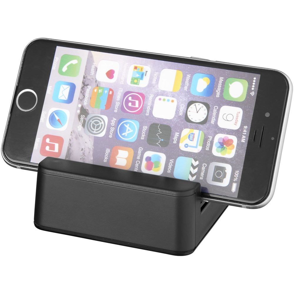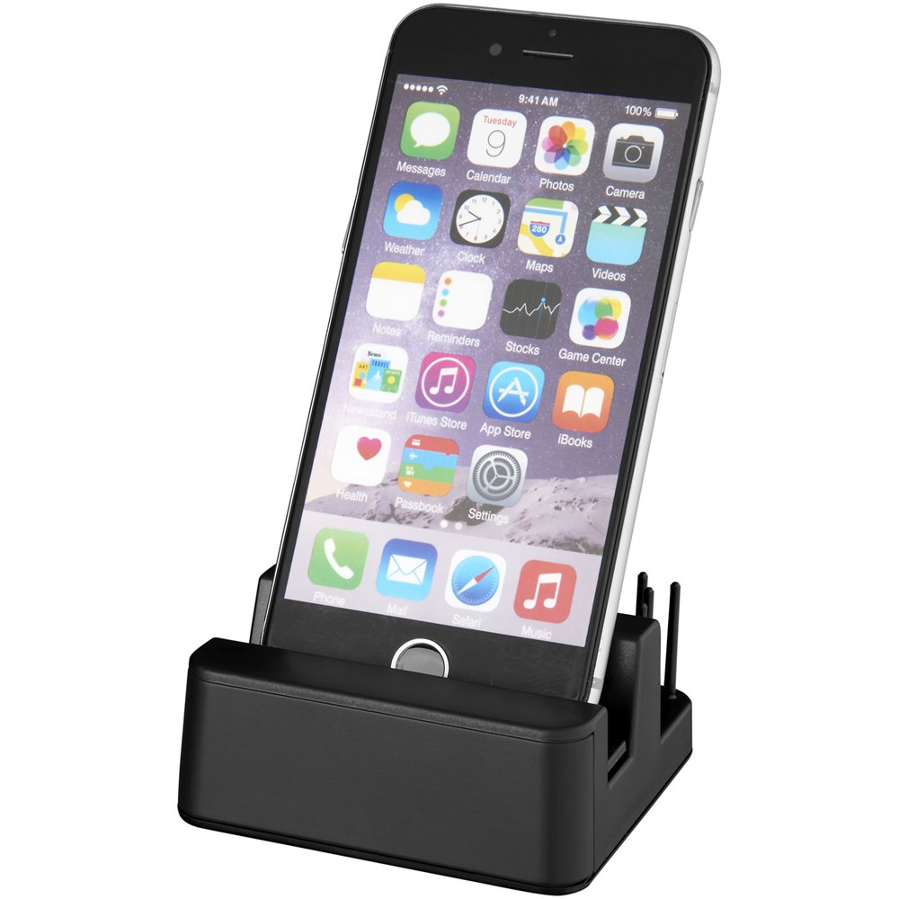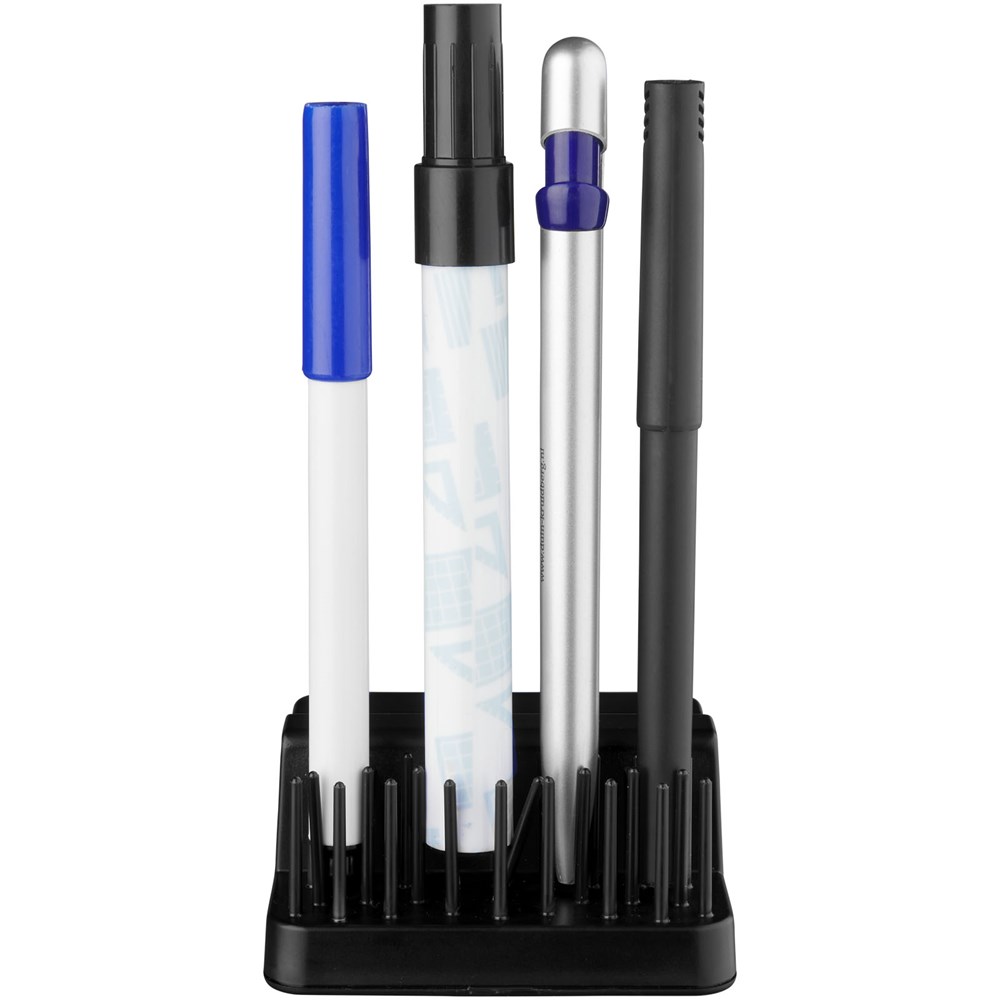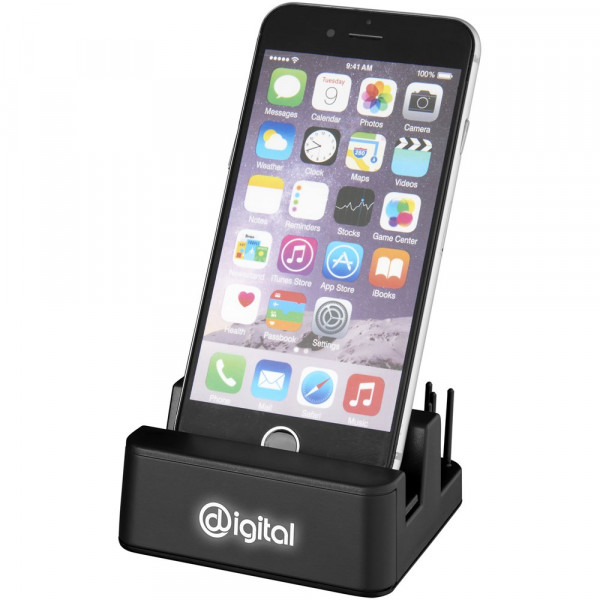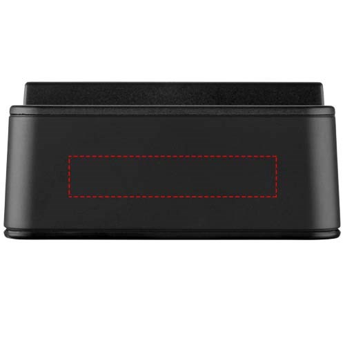 Der leuchtende Schreibtischständer Glint ist ein Multifunktionsständer, der als Ständer für Smartphones und Tablets aber auch zum Aufbewahren von Stiften verwendet werden kann. Gravieren Sie Ihr Logo auf der Vorderseite ein und er leuchtet, wenn Sie ein Gerät darauf stellen.