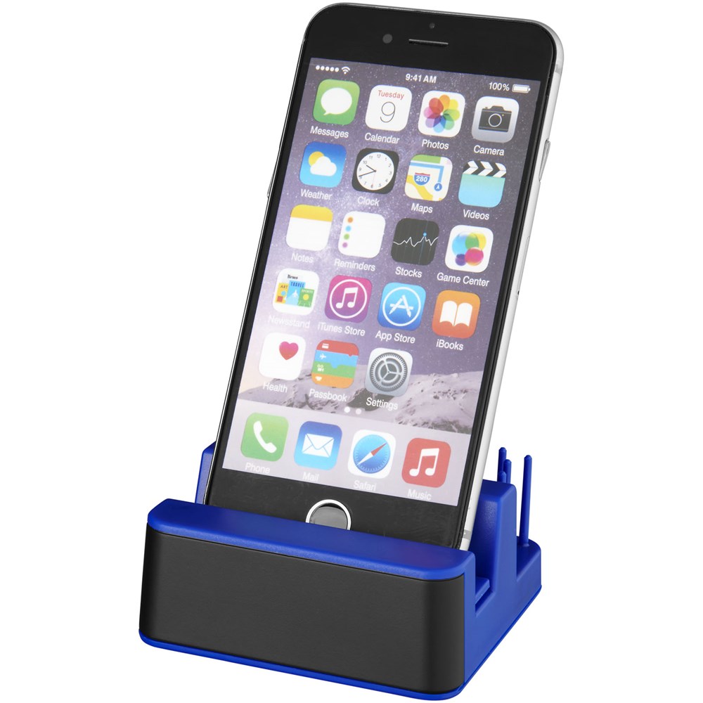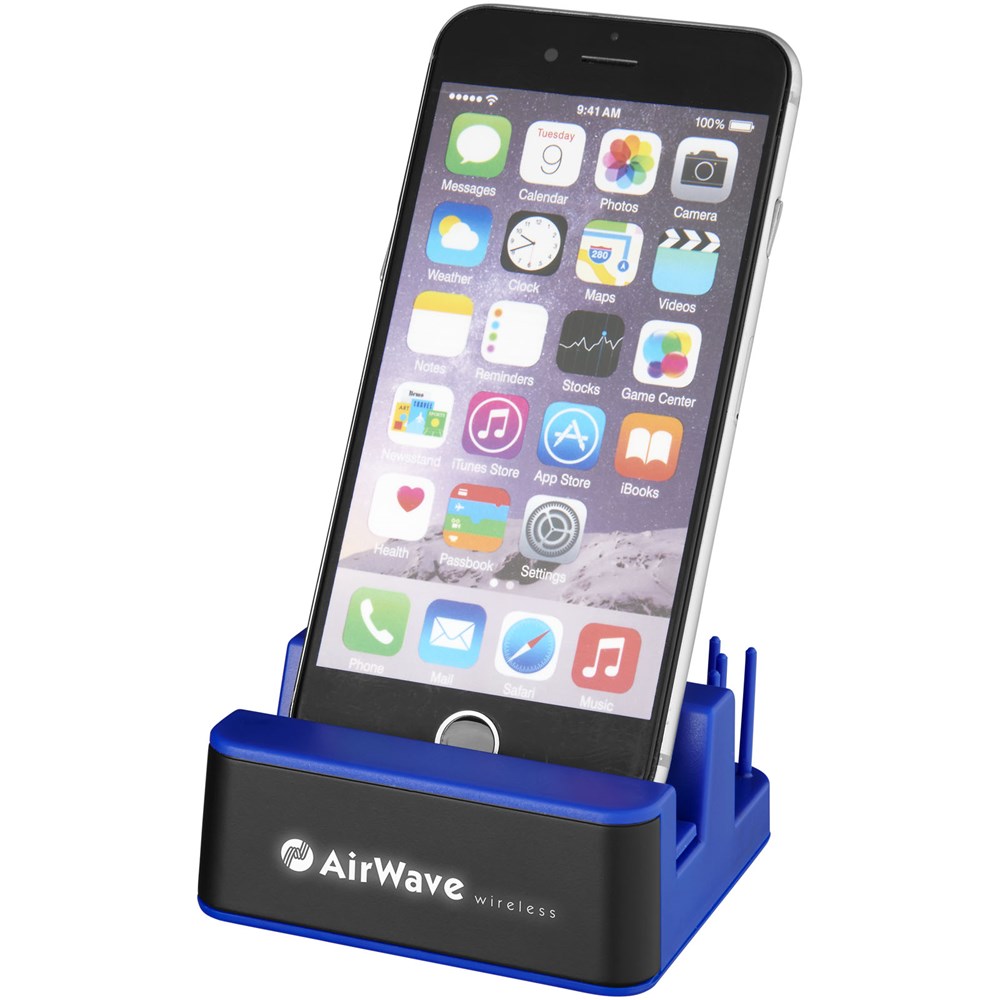 Der leuchtende Schreibtischständer Glint ist ein Multifunktionsständer, der als Ständer für Smartphones und Tablets aber auch zum Aufbewahren von Stiften verwendet werden kann. Gravieren Sie Ihr Logo auf der Vorderseite ein und er leuchtet, wenn Sie ein Gerät darauf stellen.