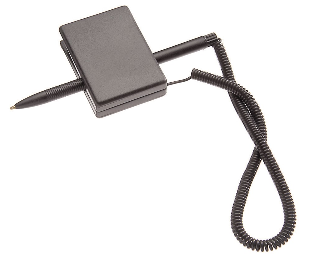 Haftklammer mit Kugelschreiber an einer Kunststoffspirale in schwarz oder weiß. Doppelkleber am Haftklammerboden.