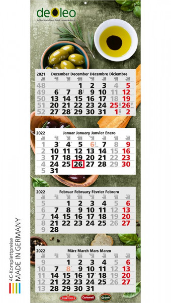 Klassischer Mehrblock-Monatskalender mit vier Kalenderblocks. Druck auf der kompletten Rückwand inklusive. Format: 330 x 900 mm | Kalendarium: Deutsch, Benelux, Österreich oder Schweiz; 4sprachig hellgrau | Ausstattung: Kalenderblocks einzeln perforiert; Rückwand zum Falten gerillt; Blockhalter-Stanzung; Aufhängeöse aus Metall; Datumsschieber rot | Werbefläche: komplette Rückwand Werbung: 4C-Druck inklusive