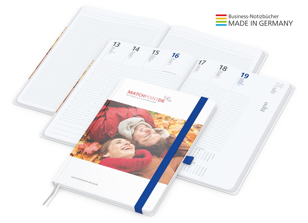 Der Hybrid-Timer für jedes Corporate Design. Individuell bedruckter Einband kombiniert mit Gummiband und Stiftschlaufe in Wunschfarbe. Wochenkalendarium Hochweiß über ein Jahr oder für A5 auch in Creme von August 2021 bis Dezember 2022. Format: A4 oder A5 | Kalendarium: Deutsch 3sprachig; Hochweiß: Januar - Dezember 2022 | Ausstattung: Hardcover mit Cover-Star-Einband (buchbinderisch verarbeiteter Einband); unwattiert; 192 Seiten; Hochweiß: 128 Seiten Kalendarium, 64 Seiten Notizen mit Winkelkaro und Mikroperforation; Creme: 160 Seiten Kalendarium (links Wochenübersicht, rechts linierte Notizseite), 32 zusätzliche Notizseiten am Buchende; Gummiband und Stiftschlaufe blau, gelb, grün, orange, rot, schwarz oder silbergrau; Einstecktasche; 2 Lesezeichen, Kapitalband; runder Rücken | Werbefläche: kompletter Einband | Werbung: 4C-Druck inklusive