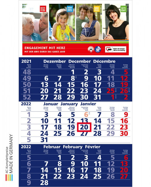 Der Monatskalender mit 3 Monaten auf einem Blatt und 3 Kalendariumsfarben zur Auswahl (anthrazit, dunkelblau, hellgrau). Kompaktes Format zum günstigen Preis Format: 300 x 490 mm | Kalendarium: Deutsch 3sprachig anthrazit, dunkelblau oder hellgrau | Ausstattung: Datumsschieber rot | Werbefläche: am Kopf | Werbung: 4C-Druck inklusive