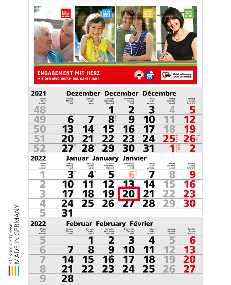 Der Monatskalender mit 3 Monaten auf einem Blatt und 3 Kalendariumsfarben zur Auswahl (anthrazit, dunkelblau, hellgrau). Kompaktes Format zum günstigen Preis Format: 300 x 490 mm | Kalendarium: Deutsch 3sprachig anthrazit, dunkelblau oder hellgrau | Ausstattung: Datumsschieber rot | Werbefläche: am Kopf | Werbung: 4C-Druck inklusive