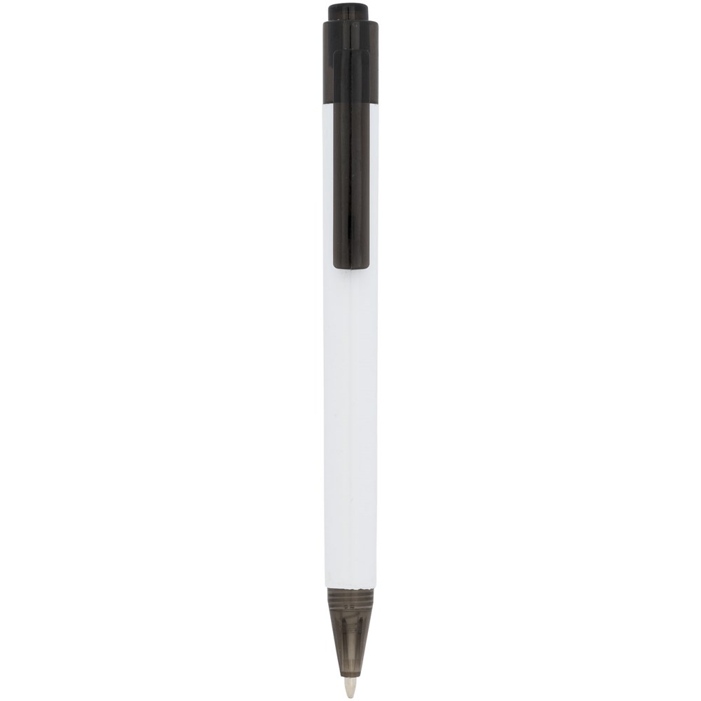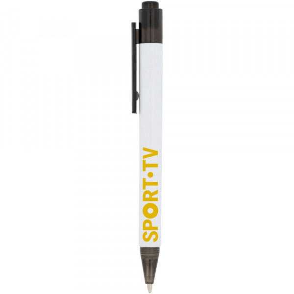 Der Calypso Kugelschreiber hat einen schlanken weißen Schaft mit durchscheinender farbiger Nase und Clip.