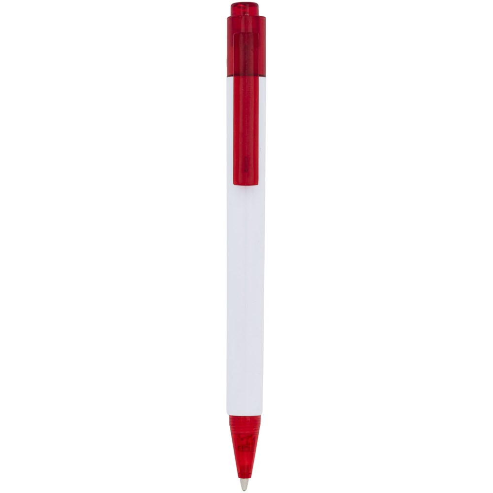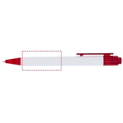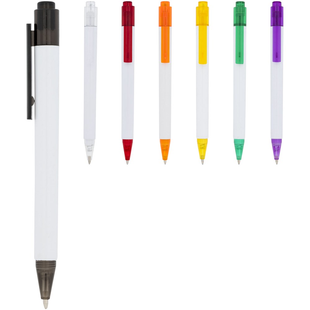 Der Calypso Kugelschreiber hat einen schlanken weißen Schaft mit durchscheinender farbiger Nase und Clip.
