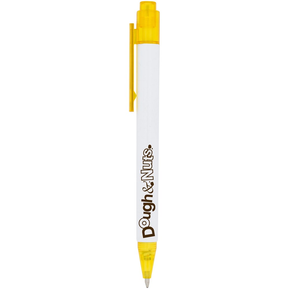 Der Calypso Kugelschreiber hat einen schlanken weißen Schaft mit durchscheinender farbiger Nase und Clip.