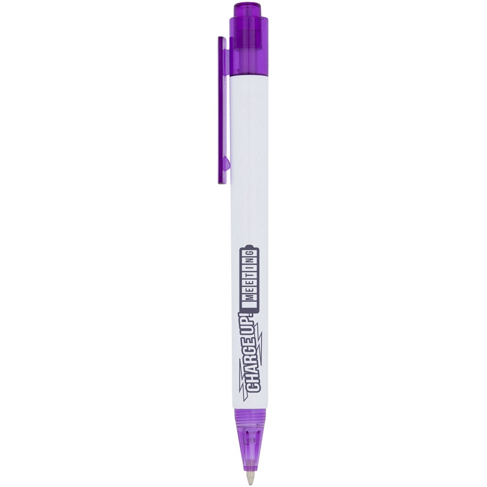 Der Calypso Kugelschreiber hat einen schlanken weißen Schaft mit durchscheinender farbiger Nase und Clip.