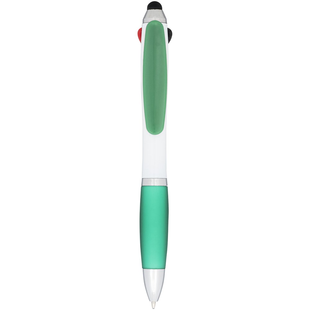 Nash Kugelschreiber mit weißem Schaft und farbigem Griff und Clip. Vier Funktionen in einem wertigen Stift: rote, schwarze und blaue Mine plus eine Stylus-Spitze. Kugelschreiber mit Klickmechanismus und Softtouch-Griff.