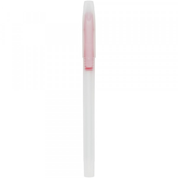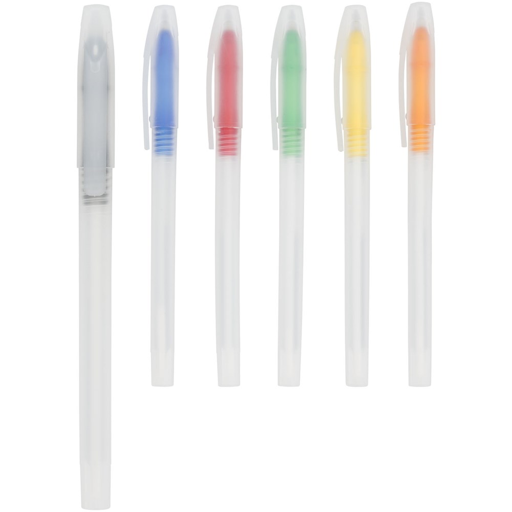 Transparenter Kugelschreiber mit abnehmbarer Kappe und farbigem Akzent.