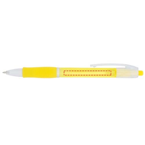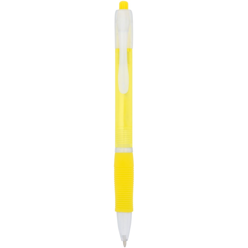 Farbiger Kugelschreiber mit Klickmechanismus mit transparentem Schaft und gummiertem Griff in passender Farbe.