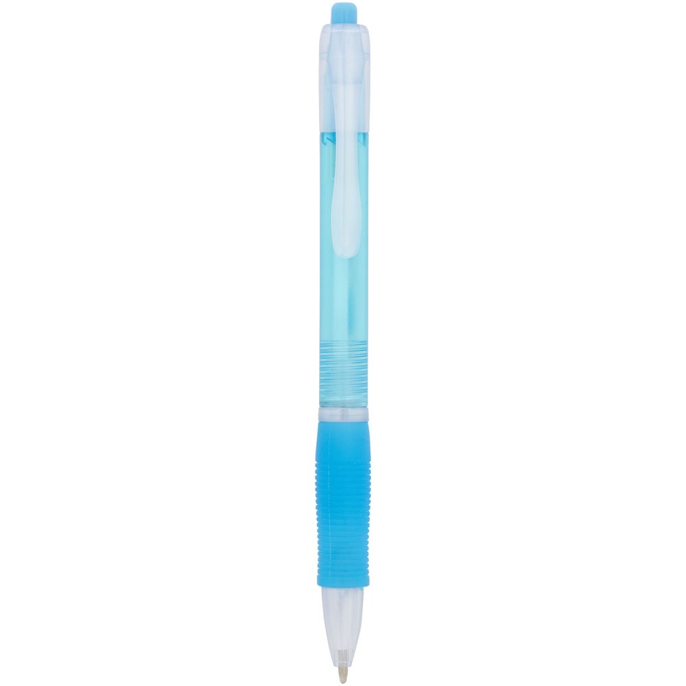Farbiger Kugelschreiber mit Klickmechanismus mit transparentem Schaft und gummiertem Griff in passender Farbe.