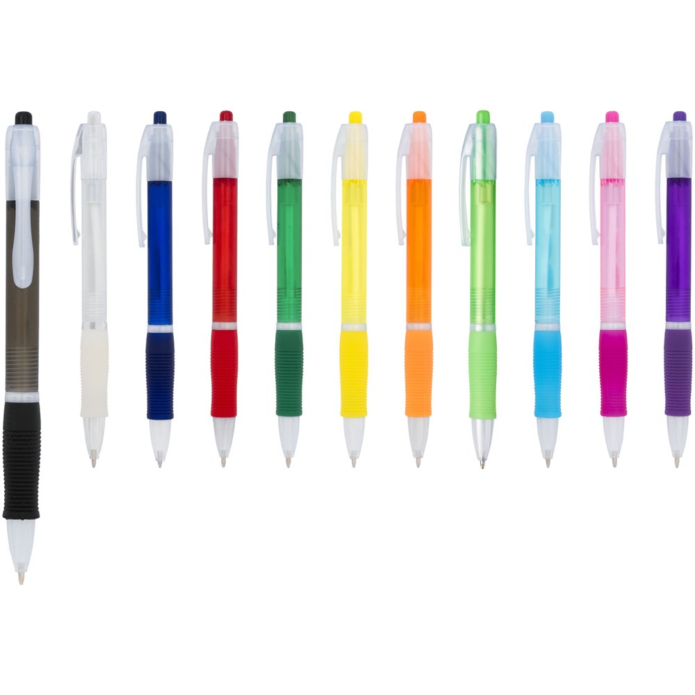 Farbiger Kugelschreiber mit Klickmechanismus mit transparentem Schaft und gummiertem Griff in passender Farbe.