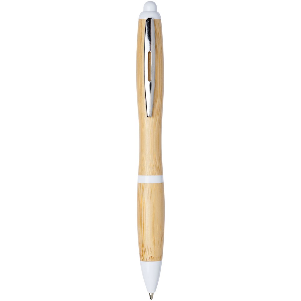 Kugelschreiber mit Klickmechanismus, mit einem Schaft aus Bambus, akzentuiert durch einen verchromten Clip und Verzierungen aus ABS-Kunststoff. Die Farbe des Bambusmaterials kann variieren.
