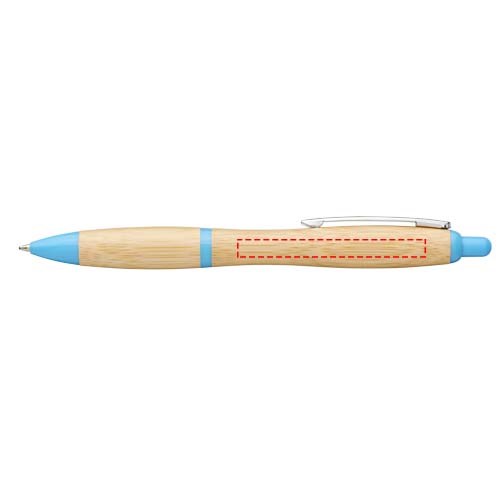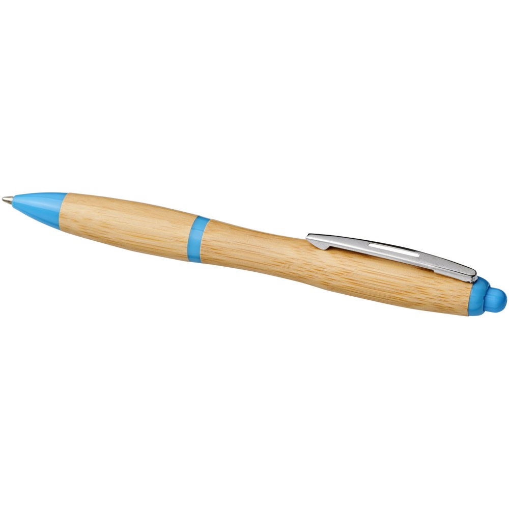 Kugelschreiber mit Klickmechanismus, mit einem Schaft aus Bambus, akzentuiert durch einen verchromten Clip und Verzierungen aus ABS-Kunststoff. Die Farbe des Bambusmaterials kann variieren.