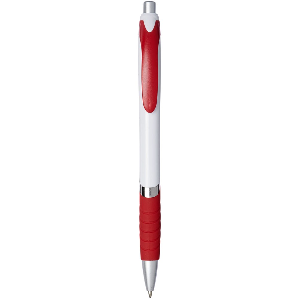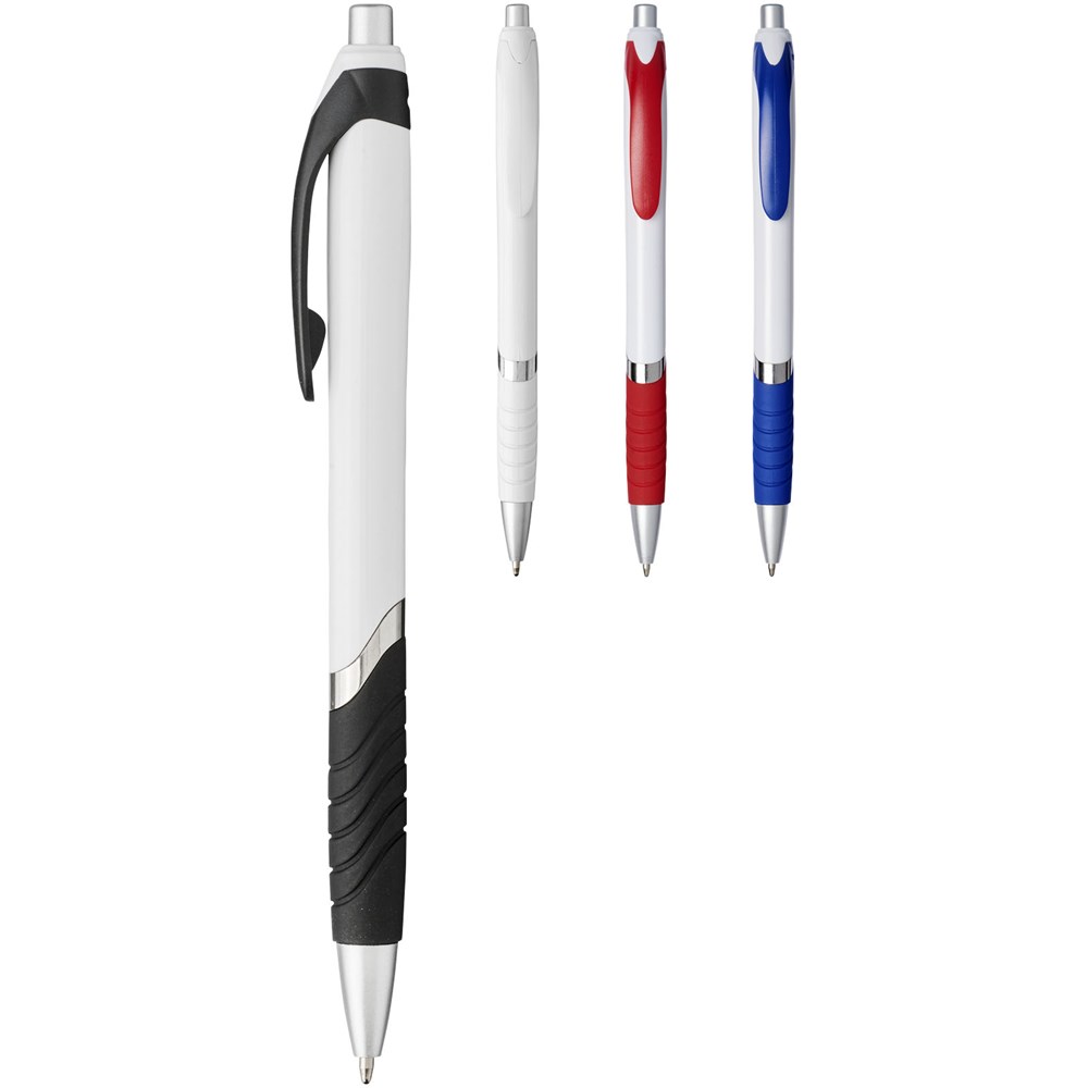 Kugelschreiber in beliebtem Stil, mit Klickmechanismus und weißem Schaft, farbigem Clip, gummiertem Griff und zusätzlichen silbernen Akzenten.