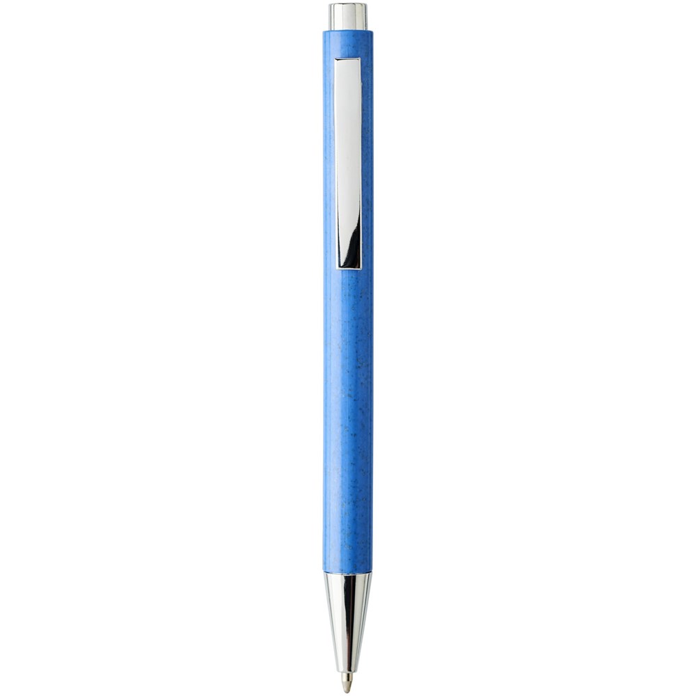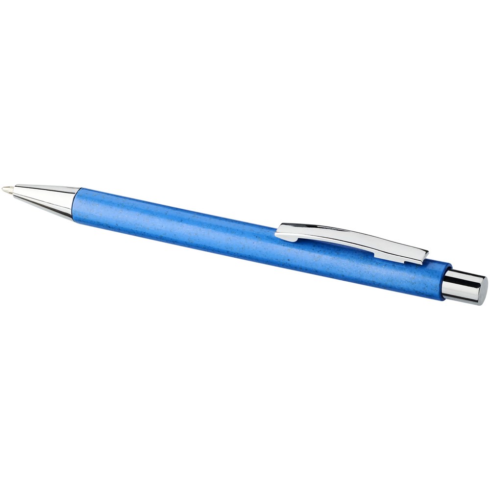 Eleganter, klassischer Kugelschreiber mit Klickmechanismus, mit Schaft aus Weizenstroh und markanten chromfarbenen Details. Bei Weizenstroh handelt es sich um zurückgebliebene Stiele nach der Ernte von Weizenkörnern, was die Menge an Kunststoff reduziert.