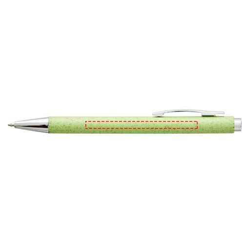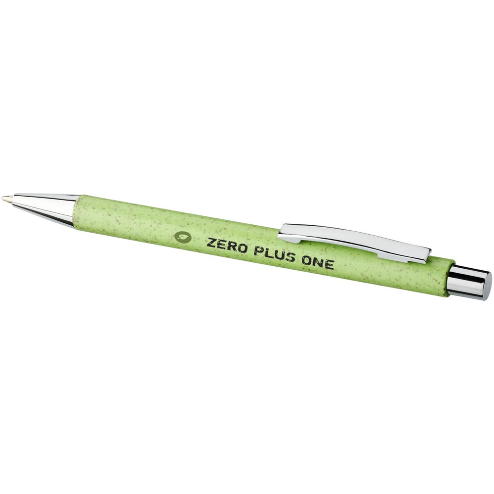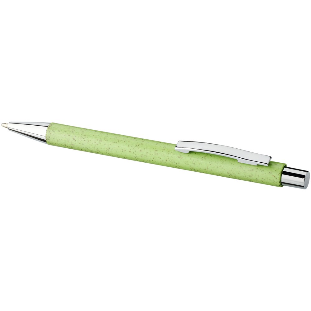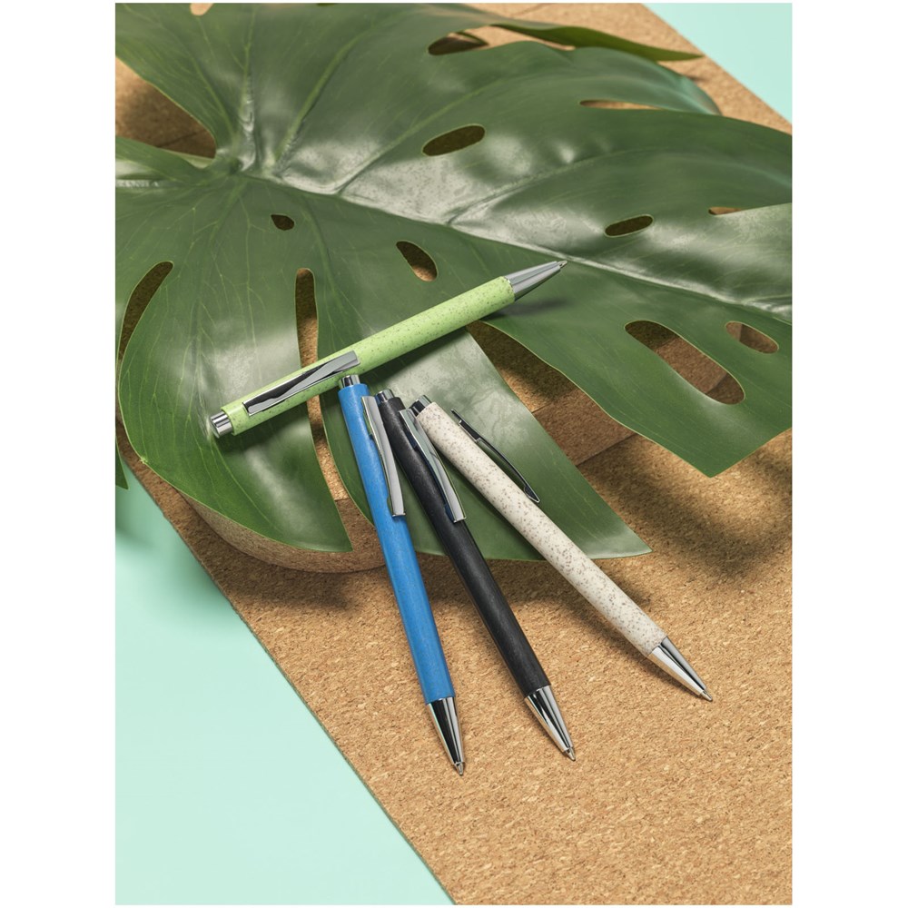 Eleganter, klassischer Kugelschreiber mit Klickmechanismus, mit Schaft aus Weizenstroh und markanten chromfarbenen Details. Bei Weizenstroh handelt es sich um zurückgebliebene Stiele nach der Ernte von Weizenkörnern, was die Menge an Kunststoff reduziert.
