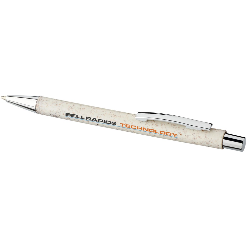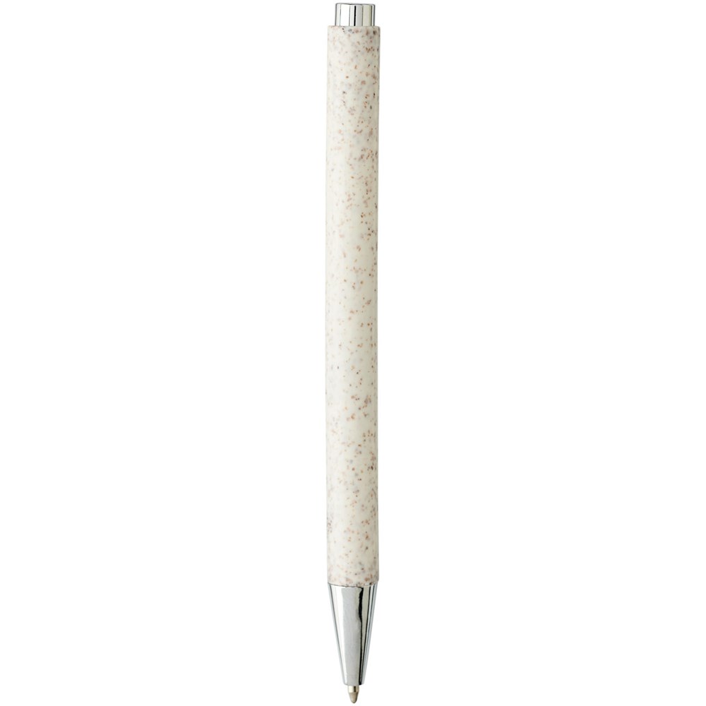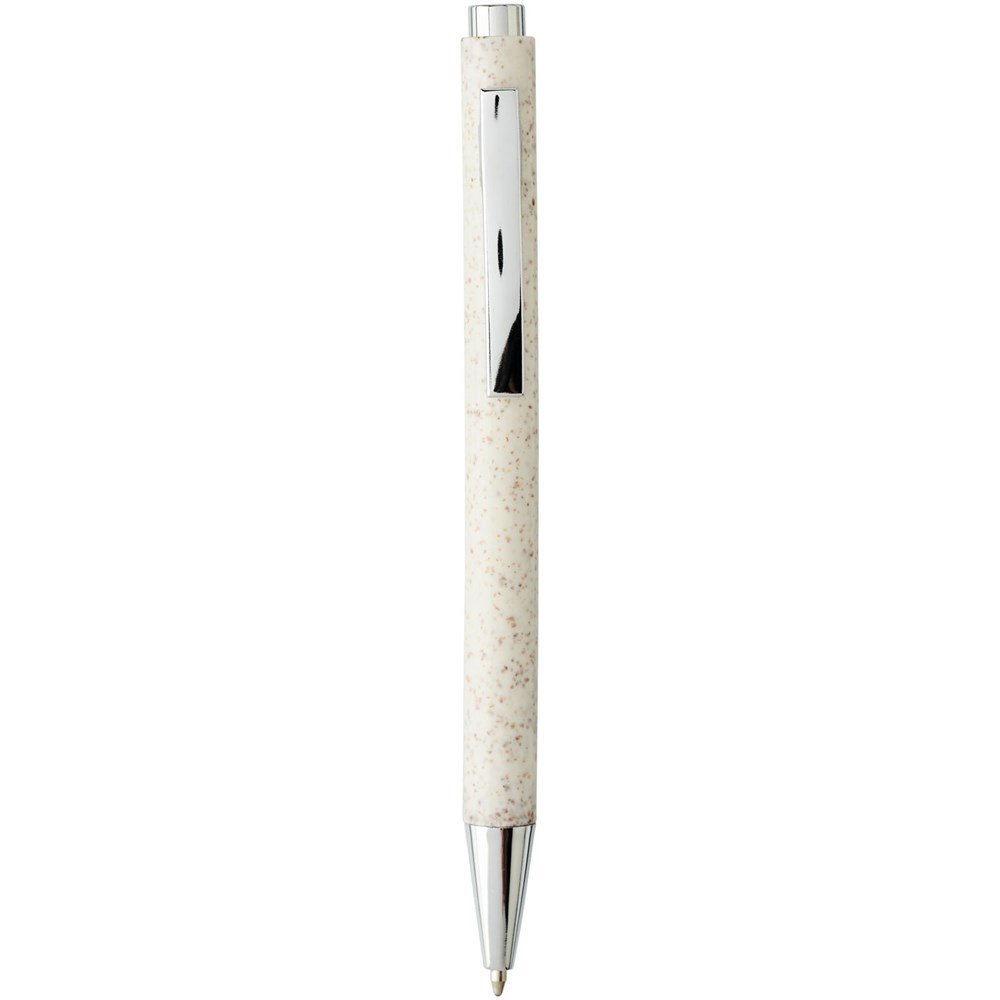 Eleganter, klassischer Kugelschreiber mit Klickmechanismus, mit Schaft aus Weizenstroh und markanten chromfarbenen Details. Bei Weizenstroh handelt es sich um zurückgebliebene Stiele nach der Ernte von Weizenkörnern, was die Menge an Kunststoff reduziert.