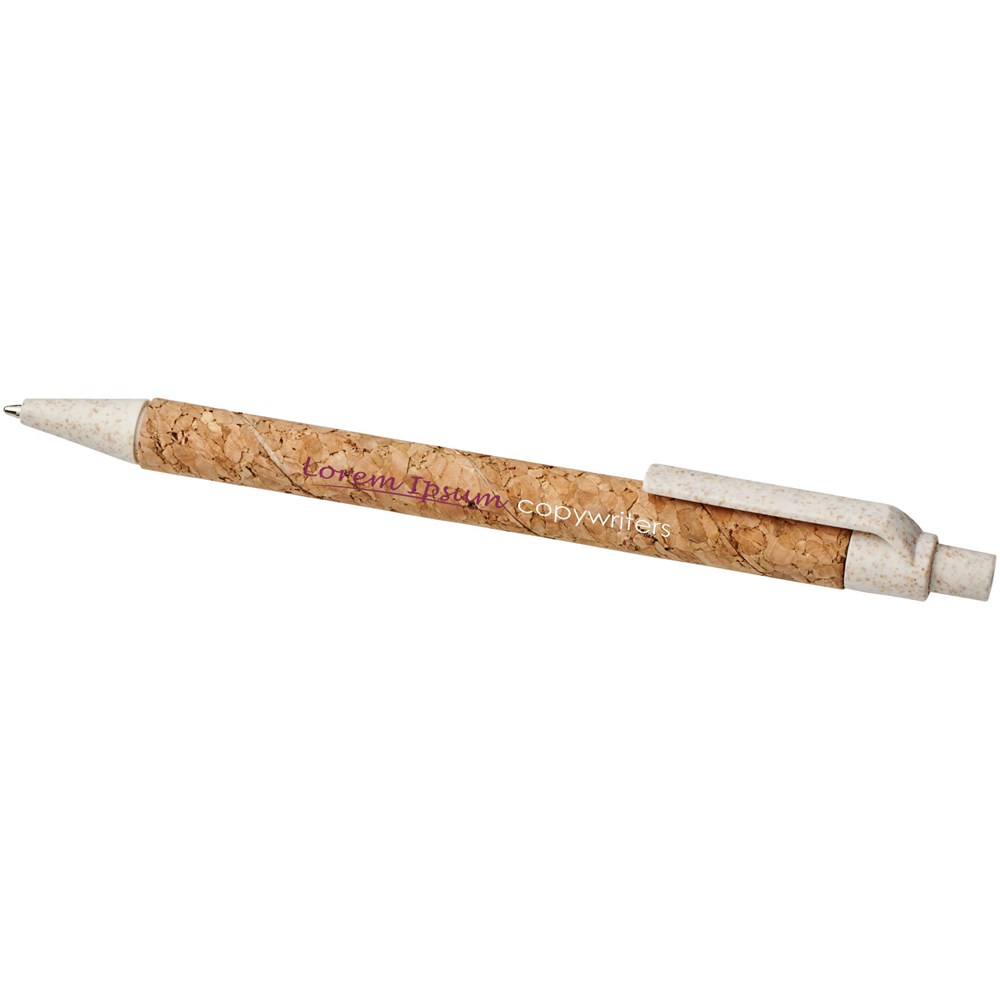 Umweltfreundlicher Kugelschreiber mit Klickmechanismus, Korkgriff und Weizenstrohverzierungen in verschiedenen Farben. Bei Weizenstroh handelt es sich um zurückgebliebene Stiele nach der Ernte von Weizenkörnern. Dadurch wird die Menge an Kunststoff reduziert und eine umweltfreundliche Alternative geschaffen. Die Farbe des Korkmaterials kann variieren.