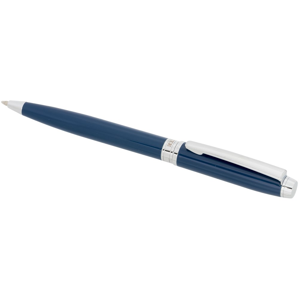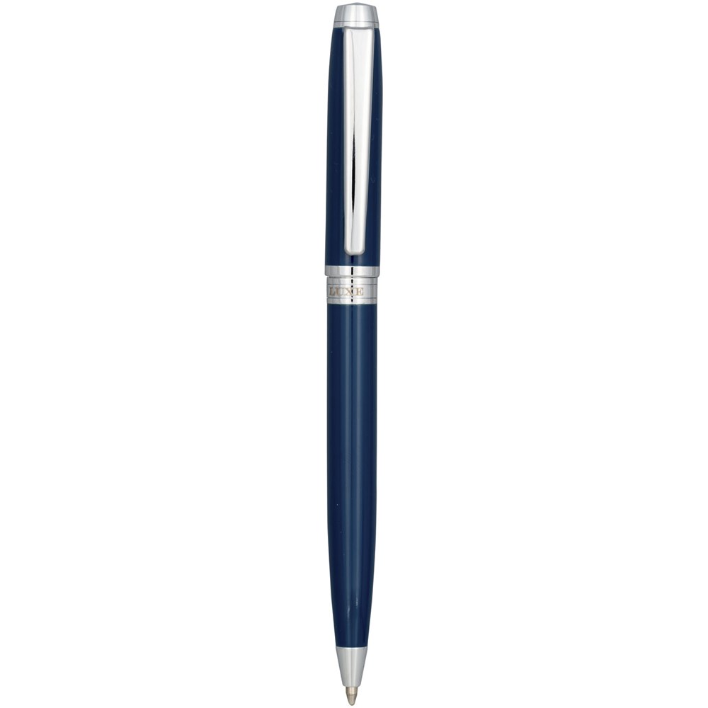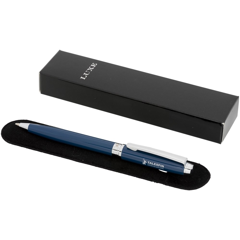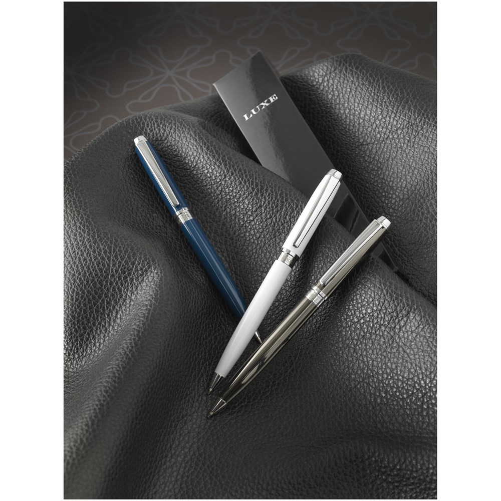 Kugelschreiber mit exklusivem Design und farbigem Schaft oben und unten. Enthält eine hochwertige schwarze Ersatz-Tintenmine und einen Samtbeutel. Verpackt in einer „LUXE“-Geschenkbox (Größe: 17 x 3,5 x 2 cm).