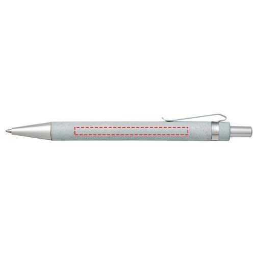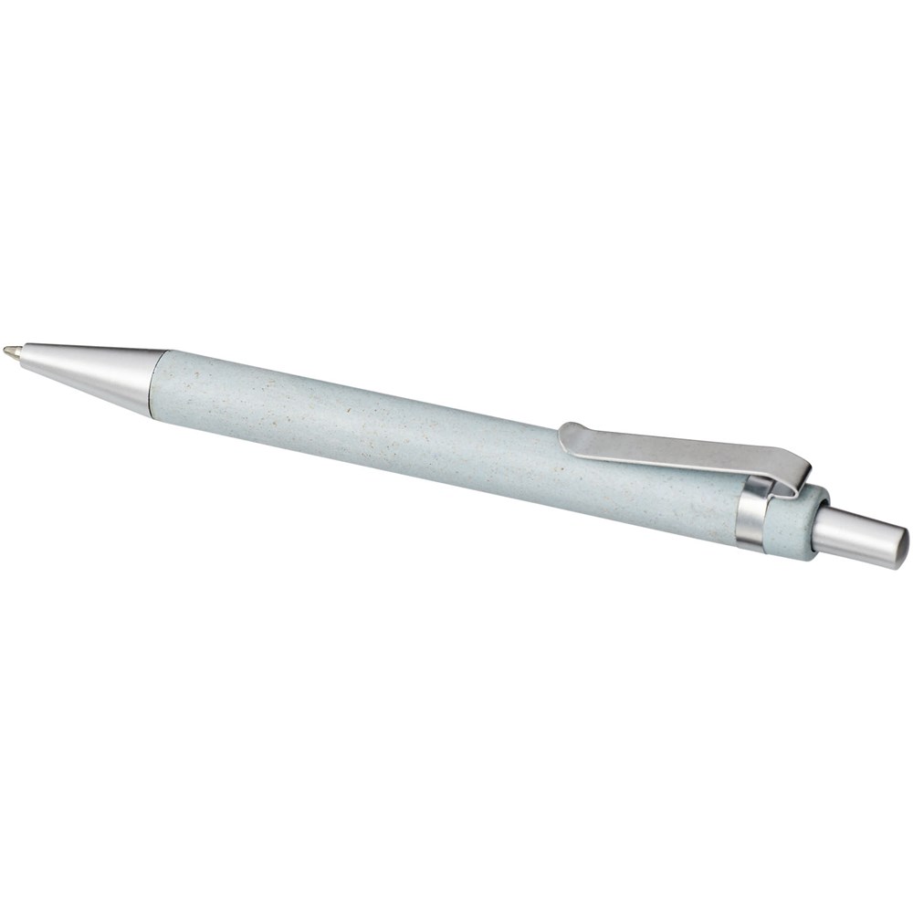 Moderner Kugelschreiber mit Klickmechanismus, mit Schaft aus Weizenstroh und markanten chromfarbenen Details. Bei Weizenstroh handelt es sich um zurückgebliebene Stiele nach der Ernte von Weizenkörnern, was die Menge an Kunststoff reduziert.