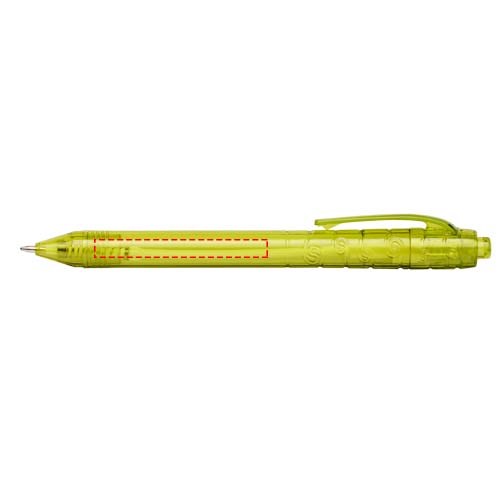 Kugelschreiber mit Klickmechanismus und transparentem Schaft. Der Schaft besteht aus recycelten Wasserflaschen, was dazu beiträgt, die Menge an Kunststoffabfällen zu reduzieren.