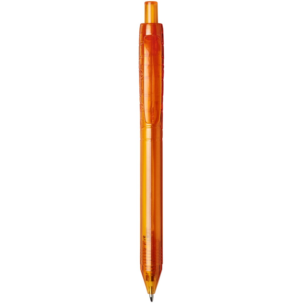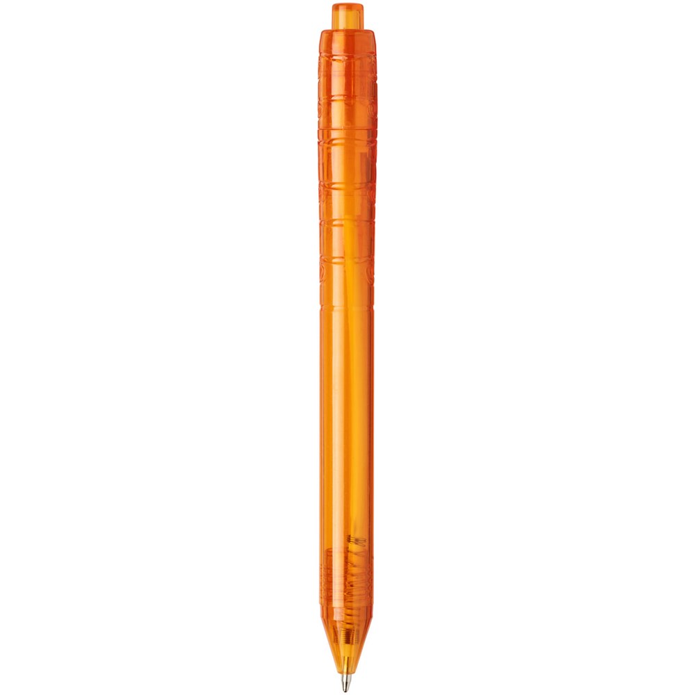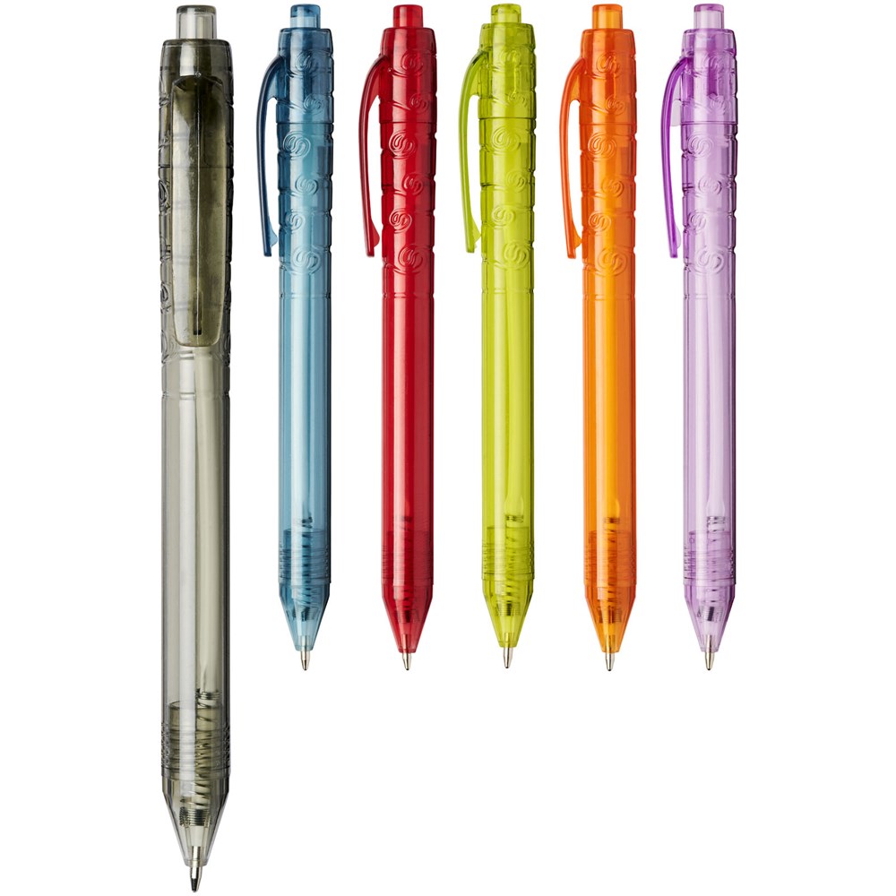 Kugelschreiber mit Klickmechanismus und transparentem Schaft. Der Schaft besteht aus recycelten Wasserflaschen, was dazu beiträgt, die Menge an Kunststoffabfällen zu reduzieren.