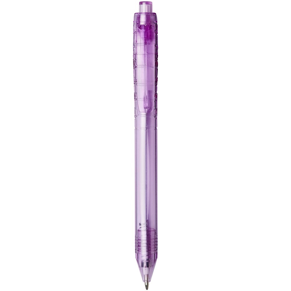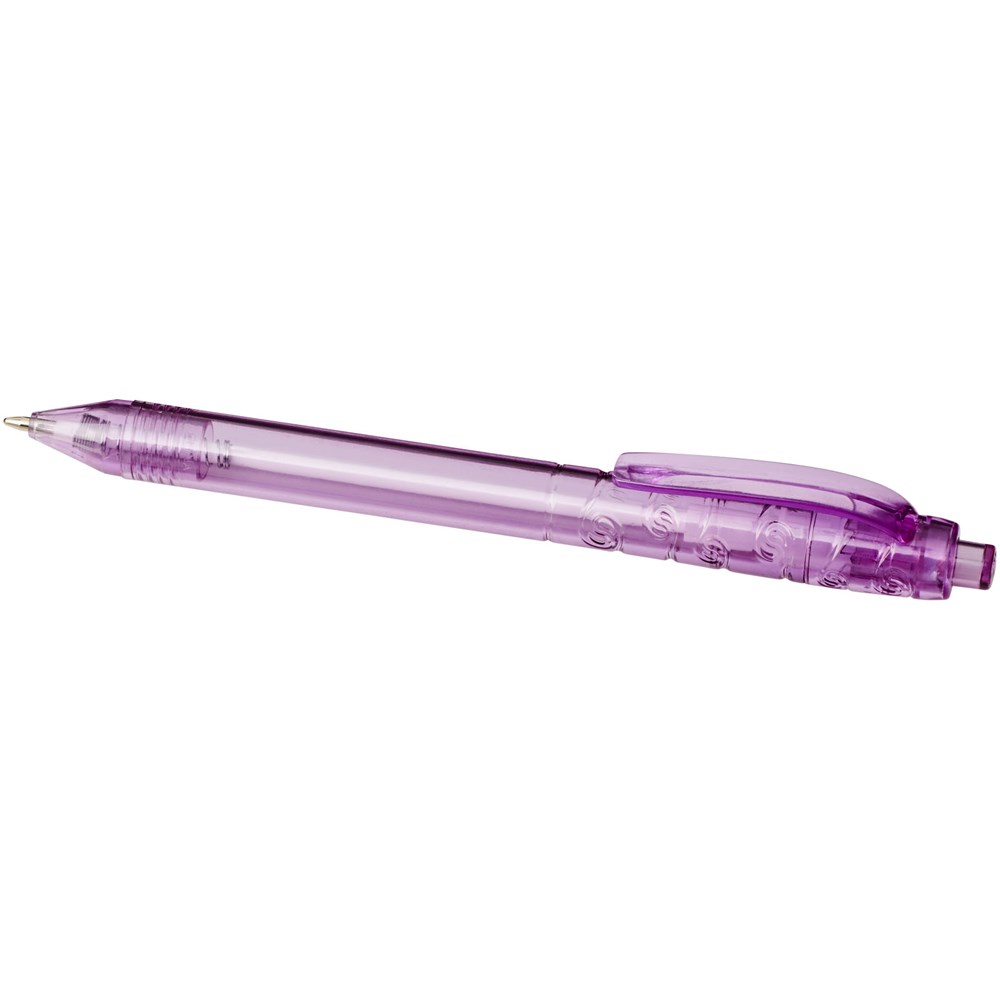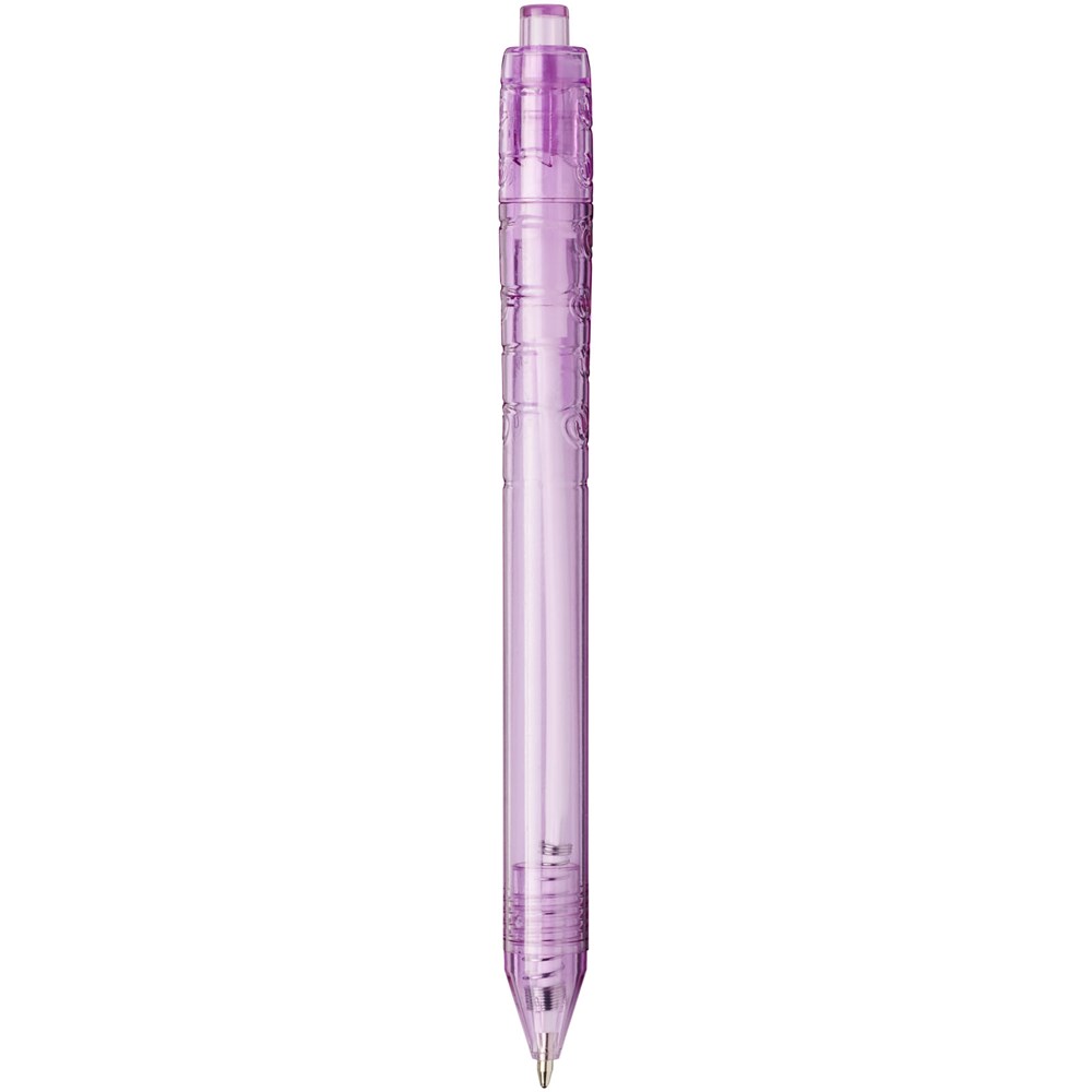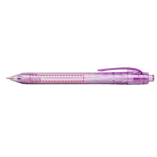 Kugelschreiber mit Klickmechanismus und transparentem Schaft. Der Schaft besteht aus recycelten Wasserflaschen, was dazu beiträgt, die Menge an Kunststoffabfällen zu reduzieren.